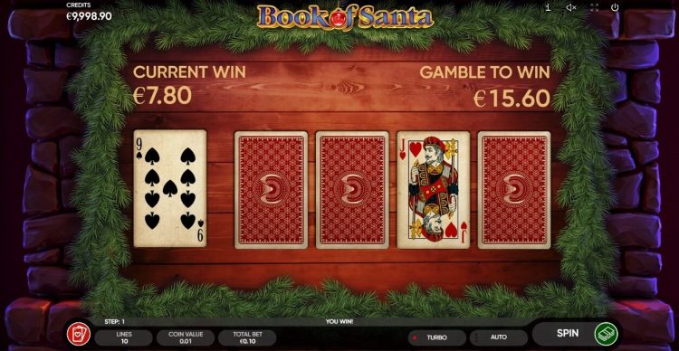 In de Book of Santa gokkast kun je proberen om je winsten te verdubbelen. Je kiest uit 4 kaarten en het is de bedoeling dat je een kaart pakt die hoger ligt dan de kaart die open op tafel ligt. Je kunt altijd even checken welke open kaart er ligt. Als dit een lage kaart is, kan het slim zijn om de gamble feature te spelen.
