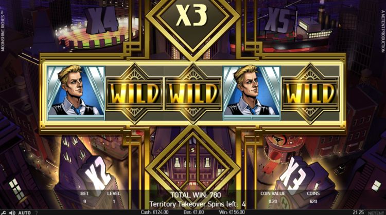 Wanneer je op dezelfde rij een Moonshine Wild landt op rol 1 en 5, activeert de Territory Takeover Spins bonus. Je krijgt 5 gratis spins die je op 1 winlijn speelt. Tijdens de bonus is elke Wild Sticky en levert deze een extra spin op. Bij elke draai wordt de Multiplier ook met 1 punt verhoogd met de mogelijkheid om Multipliers tot x9 te winnen. Ook gelden winnende combinaties beide kanten op.