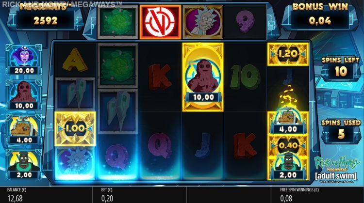 Om Free Spins te winnen, heb je 4 ‘portal gun’ Bonus symbolen nodig in je speelveld. Je kiest dan zelf uit drie verschillende bonusspellen met 12 Free Spins of voor een willekeurig bonusspel: